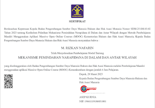 Terkininet - Sertifikat MOOC adalah sebuah surat keterangan dalam bentuk PDF yang menyatakan bahwa seorang pegawai telah berhasil menyelesaikan pelatihan atau kursus MOOC secara online dengan memenuhi passing grade. Sertifikat pelatihan tersebut diwajibkan untuk di upload oleh Kemenkumham sebagai bukti administrasi pegawai dalam memenuhi hak 20 Jam pelatihan dalam setahun.